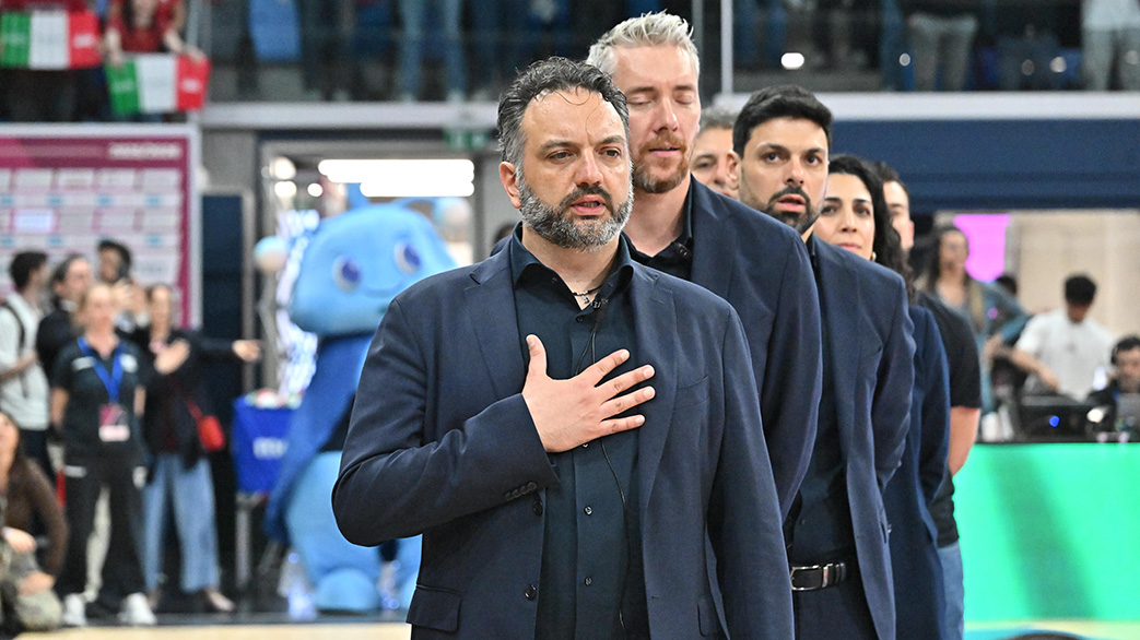 DA SX STEFANO LAVARINI LUCA BUCAIONI ANDREA MAFRICI E MARIANA CARRATI NUMIA VERO VOLLEY MILANO - PROSECCO DOC CARRARO IMOCO CONEGLIANO PALLAVOLO CAMPIONATO ITALIANO VOLLEY SERIE A1-F 2025 - 2026 FINALE PLAYOFF SCUDETTO GARA 2 MILANO 15-04-2026 FOTO FILIPPO RUBIN / LVF